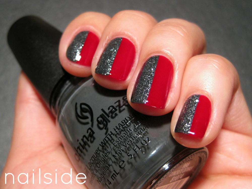 That's right! I'm finally doing the 31 Day Challange! The task for day 1 is to make red nails and this is my attempt. Okay, so it's just as much grey as it is red. :-P But I decided to allow myself to have a little bit of freedom with this challenge, hope that's okay! ;-) For this simple fifty-fifty tape mani I started with a sexy red basecolor, #85 from Hema (a Dutch department store). When that had dried, I covered half of each nail with tape and painted the other half with a thin layer of China Glaze Concrete Catwalk and Tinsel Town. After removing the tape again, this is the end result; vampy and sparkly, can't say no to that! ^^