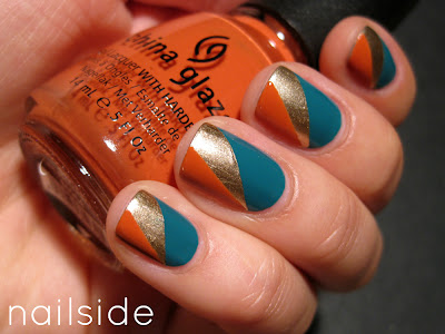 Hello lovely readers! For this post I have this colorful divergence mani to show you. In the pictures I'm holding China Glaze Life Preserver, a dusty orange creme. Orange is probably my least favorite color when it comes to nail polish (next to browns), but I actually really like Life Preserver in this mani! It adds that bit of warmth to the whole. The other polishes you see in this tape mani are Diamond Cosmetics Don't Teal My Heart Away (absolutely smitten with this polish ♥) and China Glaze 2030, the gold chrome. Thank you for reading! :-)